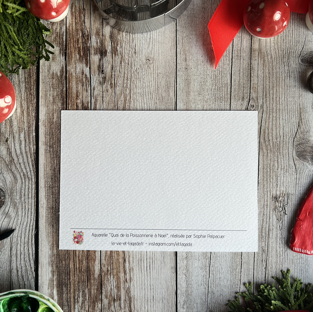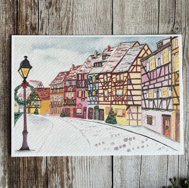 Carte réalisée à partir d'une de mes aquarelles originales, peinte dans mon atelier, à Colmar, en Alsace. Elle représente les maisons à colombages alsaciennes de la Petite Venise à Colmar, sous la neige et décorées pour Noël.