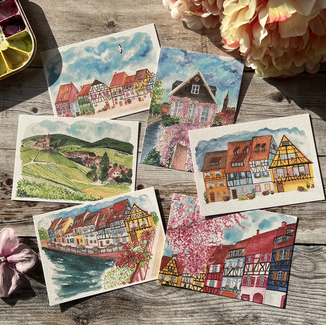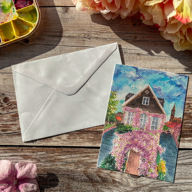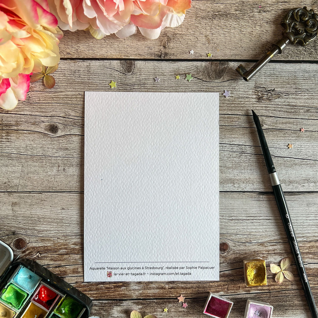 Carte réalisée à partir d'une de mes aquarelles originales, peinte dans mon atelier, à Colmar, en Alsace. Elle représente la maison aux glycines, aux ponts couverts à Strasbourg. On aperçoit la magnifique cathédrale de Strasbourg en arrière plan.