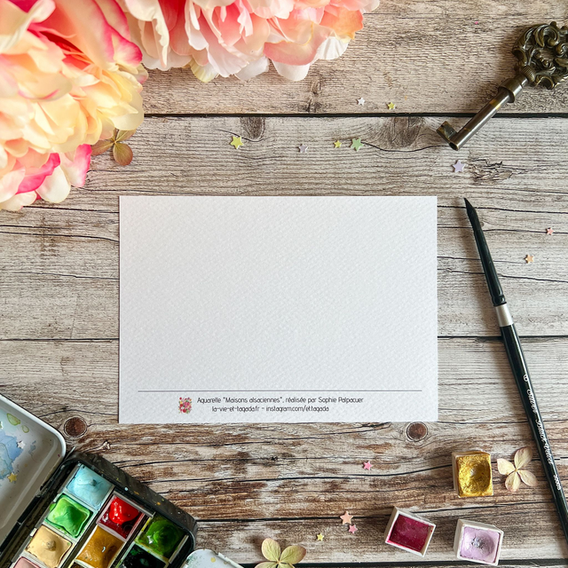Carte réalisée à partir d'une de mes aquarelles originales, peinte dans mon atelier, à Colmar, en Alsace. Elle représente les maisons à colombages alsaciennes, et leurs couleurs vives.