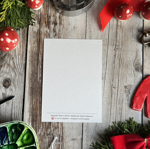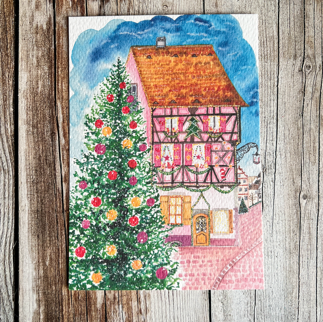 Carte réalisée à partir d'une de mes aquarelles originales, peinte dans mon atelier, à Colmar, en Alsace. Elle représente la maison du Pèlerin, à Colmar, décorée pour Noël.