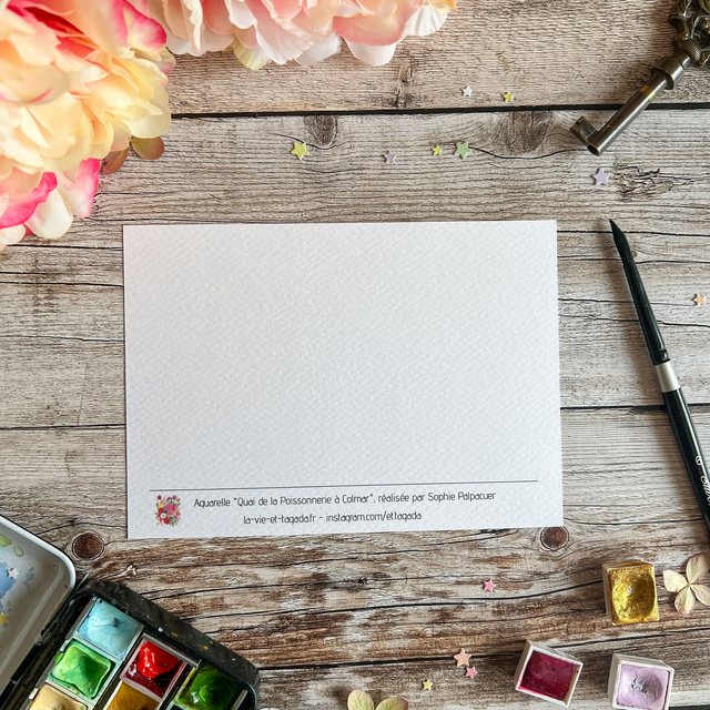 Carte réalisée à partir d'une de mes aquarelles originales. Elle représente les maisons colorées du quai de la Poissonnerie à Colmar.